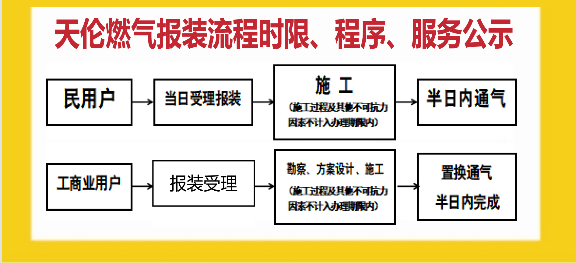3、現(xiàn)場施工質(zhì)量符合規(guī)范要求,民用戶當日受理報裝,施工,半日內(nèi)通氣;工商業(yè)用戶前往天倫客服前臺填寫報裝申請表即時受理,勘察現(xiàn)場、方案設(shè)計、施工、置換通氣半日內(nèi)完成,依實際情況進行施工,若不具備施工條件的,提前向用戶說明并另行約定時間。施工現(xiàn)場做到文明施工、保證施工質(zhì)量,施工完畢應(yīng)做到料凈、場地清。