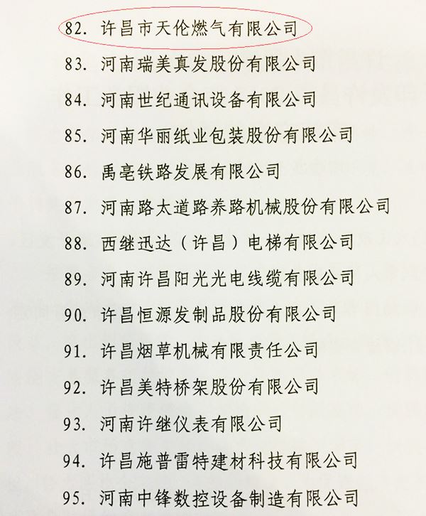2015年2月28日,許昌市政府召開全市工業(yè)大會,市長張國暉主持會議。會議總結(jié)了2014年全市工業(yè)發(fā)展情況、部署了2015年工業(yè)和信息化發(fā)展工作,公布了許昌市100戶重點企業(yè)名單,許昌市天倫燃氣有限公司位列其中。