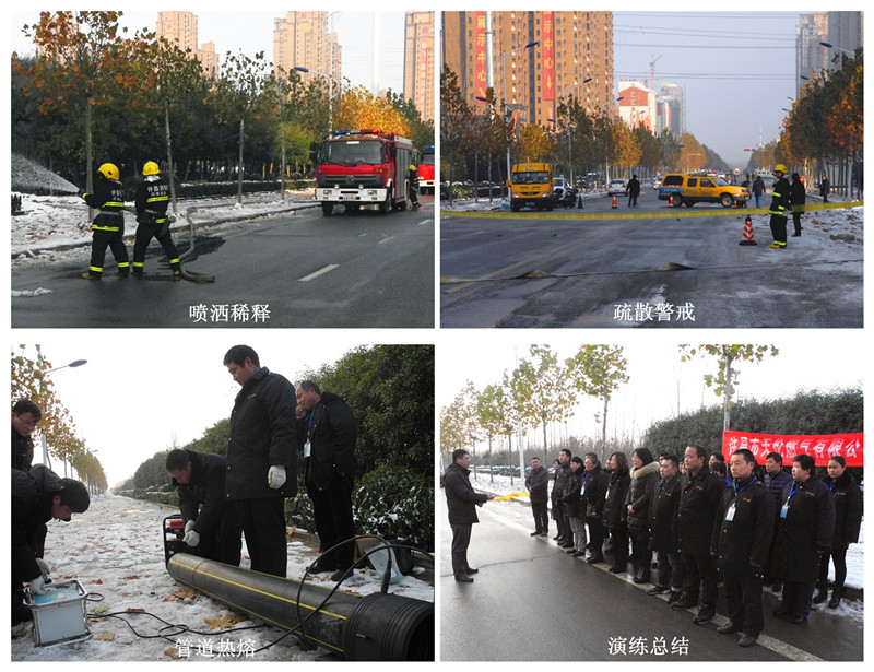 15時(shí)10分,消防隊(duì)到達(dá)現(xiàn)場(chǎng),開(kāi)展噴灑作業(yè)稀釋燃?xì)鉂舛?、疏散人群封鎖道路;15時(shí)15分,公司搶險(xiǎn)隊(duì)到達(dá)現(xiàn)場(chǎng),與消防隊(duì)配合關(guān)閉上下游控制閥門、滅火、檢測(cè)現(xiàn)場(chǎng)燃?xì)鉂舛炔⑾蚋浇^(qū)張貼停氣通知;15時(shí)30分,搶修隊(duì)開(kāi)始對(duì)DE250中壓管道搶修,刮口、固定、焊接;15時(shí)45分,搶修完畢;開(kāi)啟控制閥門、查漏、置換、恢復(fù)供氣、打掃現(xiàn)場(chǎng);16時(shí),演練圓滿完成。